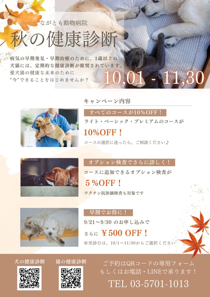 2025年9月17日 / 最終更新日 : 2025年9月19日 clinic 秋の健康診断のお知らせ 10月・11月は健康診断が通常価格より10%OFFに!健診結果は冊子にまとめ、獣医師よりご説明いたします。 ご予約・検査内容の確認はこちらから↓ 犬の健康診断 ・ 猫の健康診断