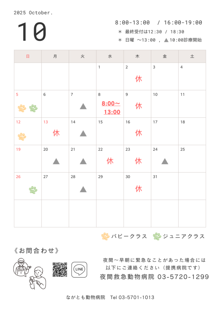 なお、10月20日~24日はスタッフ研修のため、動物看護師が不在となります。予約されていない場合、普段よりもお待たせ時間が長くなる可能性がございます。ご迷惑をおかけいたしますが、よろしくお願いいたします。